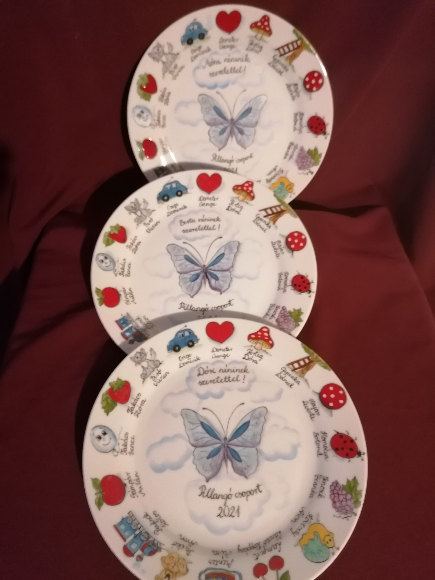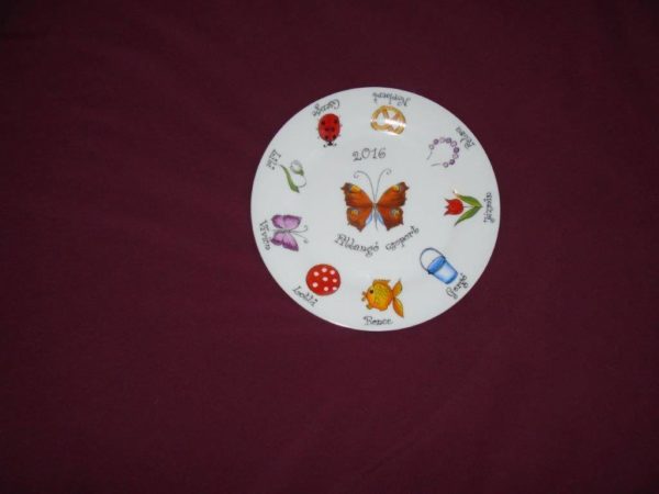 Ballagási ajándék óvó néninek, tányér jelekkel ovisoknak, pillangóval 24cm