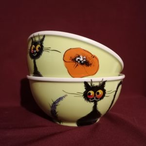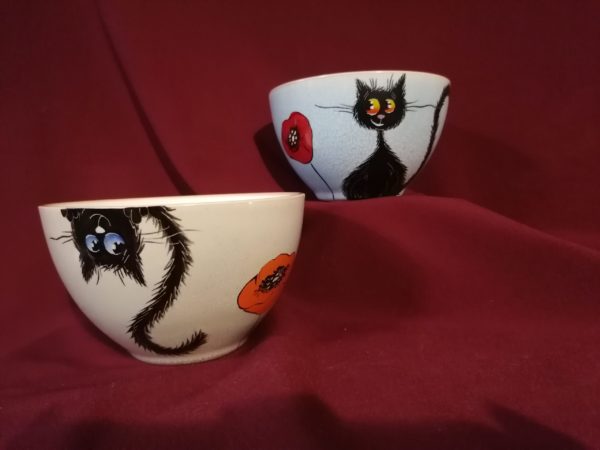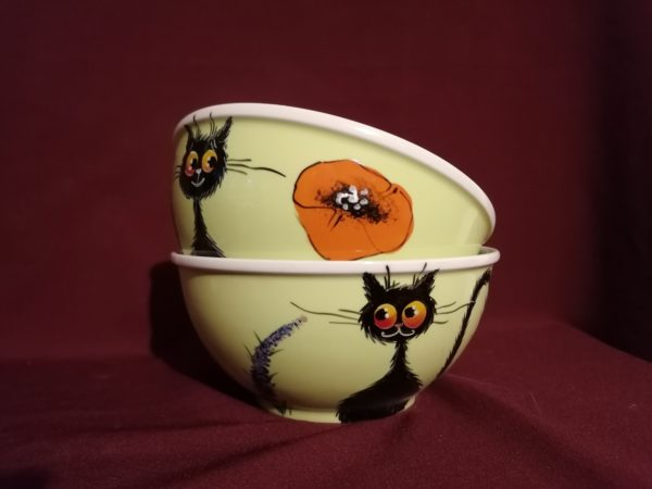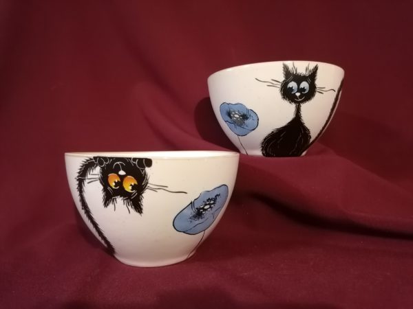 Kézzel festett bolondos macskás müzlis tálka.
