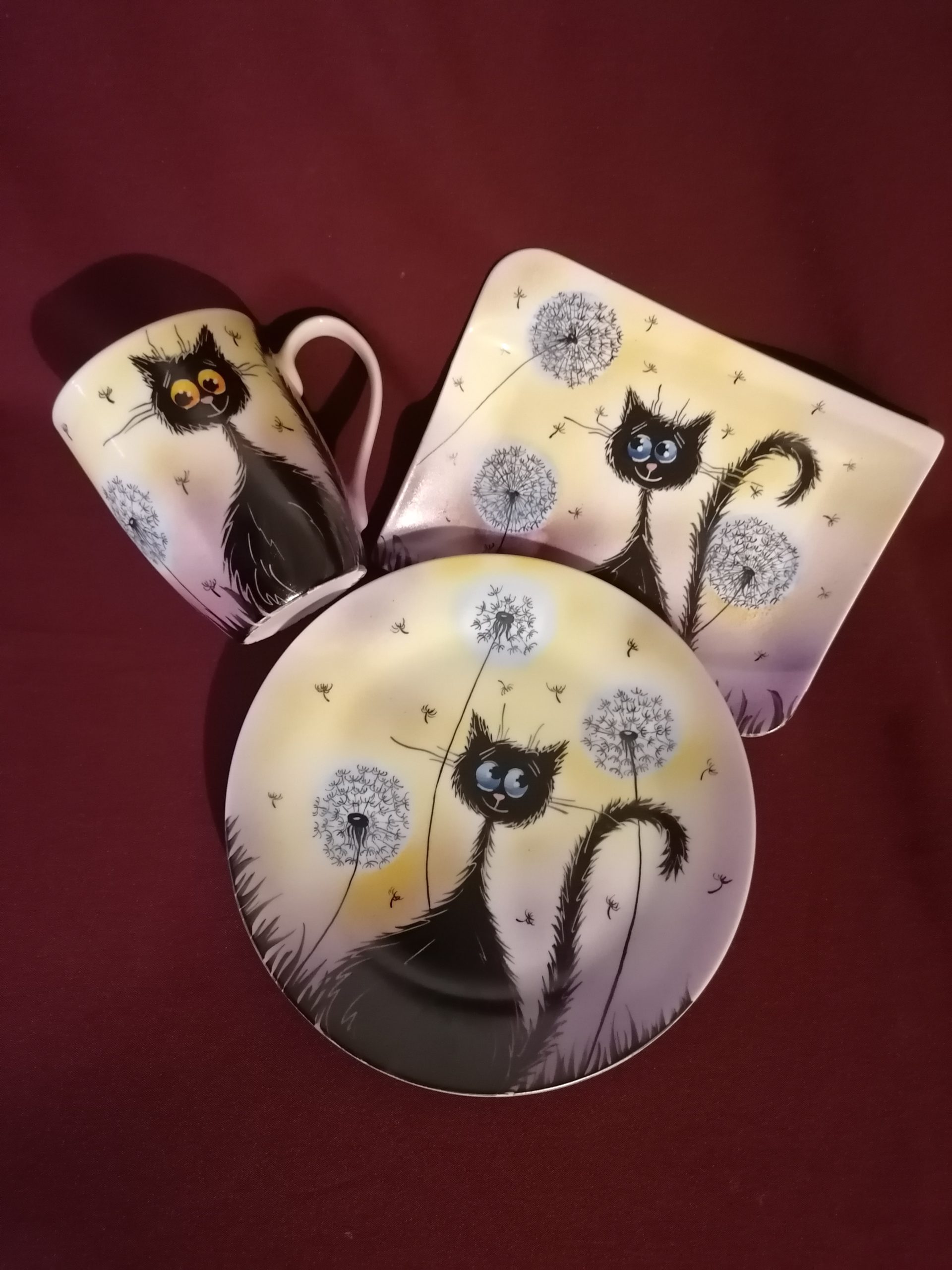 Kézzel festett cicás szett pitypanggal 1 db bögre, 1 db 20 cm-es tányér, 1 db kínáló