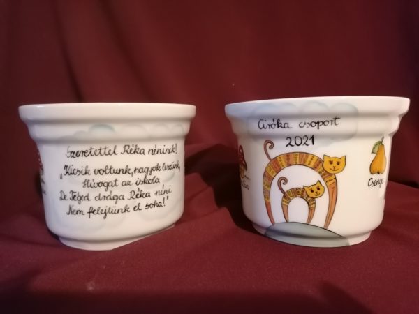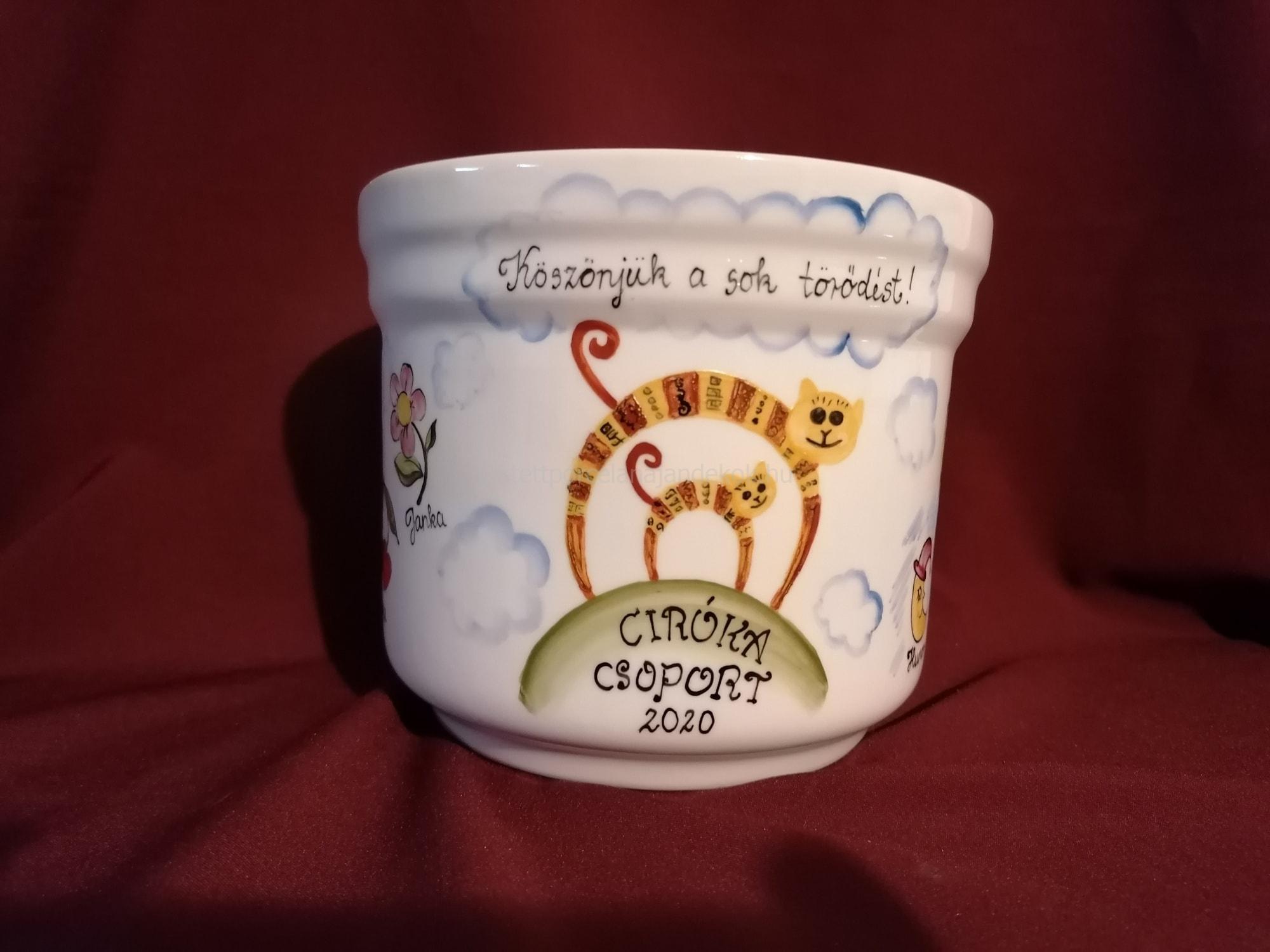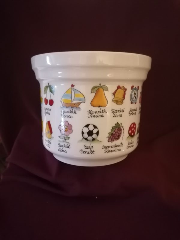 Búcsúajándék óvónőknek ballagásra csoportjelekkel .Kézzel festett porcelán kaspó egyedi mintával óvodai, bölcsődei ballagásra. A gyerekek nevével, egyedi felirattal és csoportjellel, vagy tetszőleges mintával rendelhető, 12-es (orchidea méret), 16-os és 20-as méretben. A termék ára és mérete a létszámtól függően változik.
