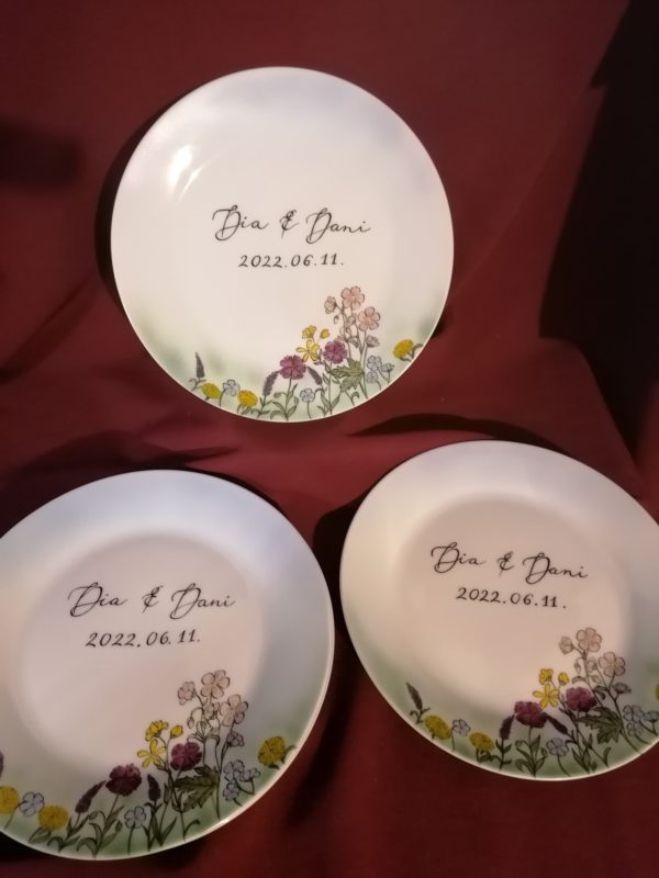 Esküvői köszönetajándék, személyre szabott mintával, tányérra, bögrére, és egyéb porcelánra is kérhető!