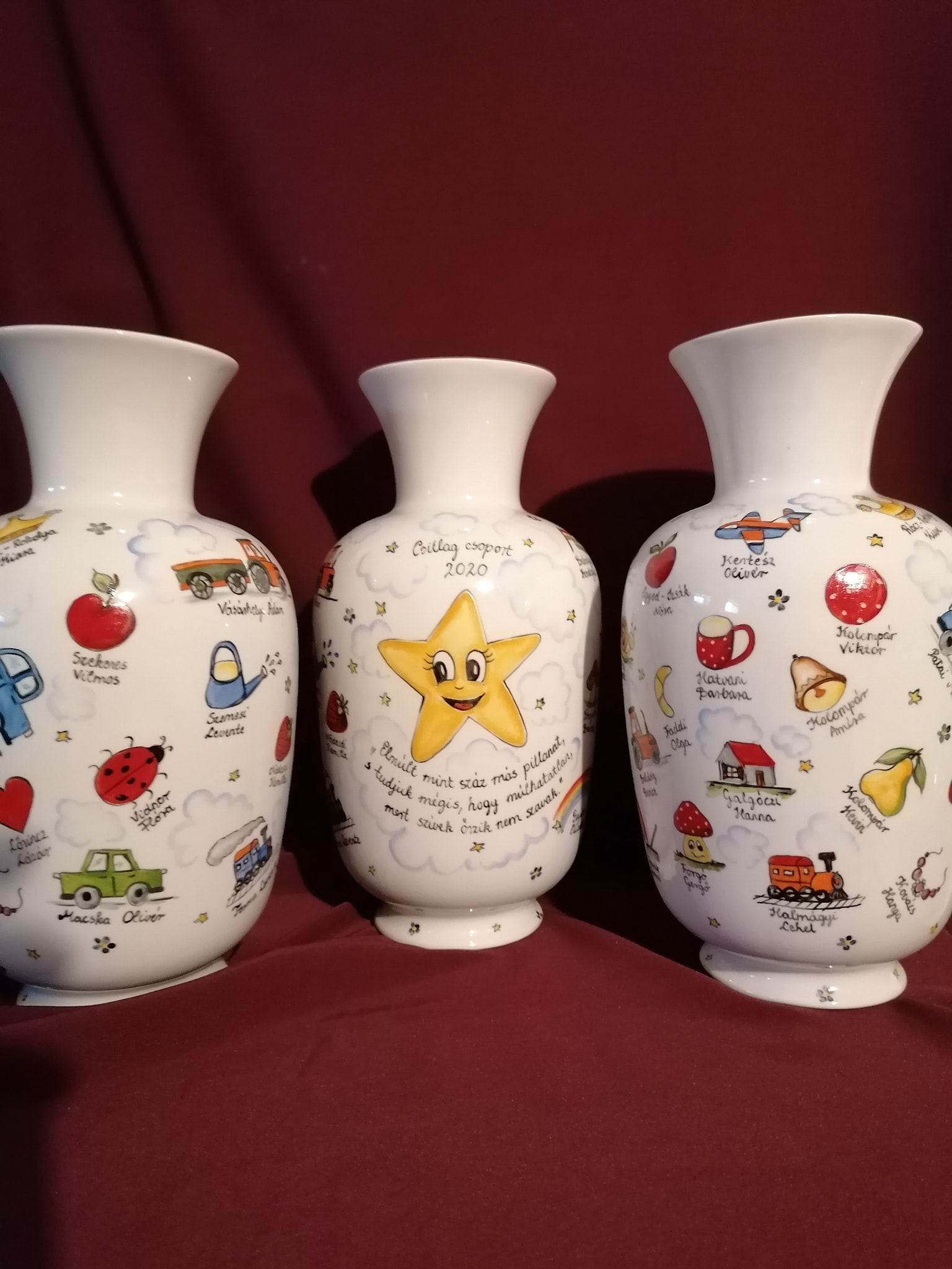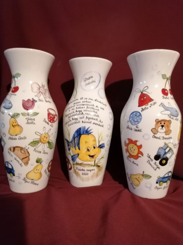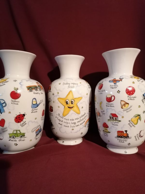 Kézzel festett porcelán váza egyedi mintával óvodai, bölcsődei ballagásra.