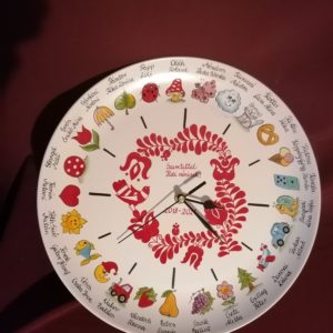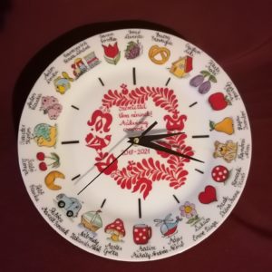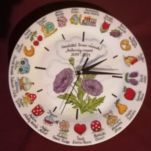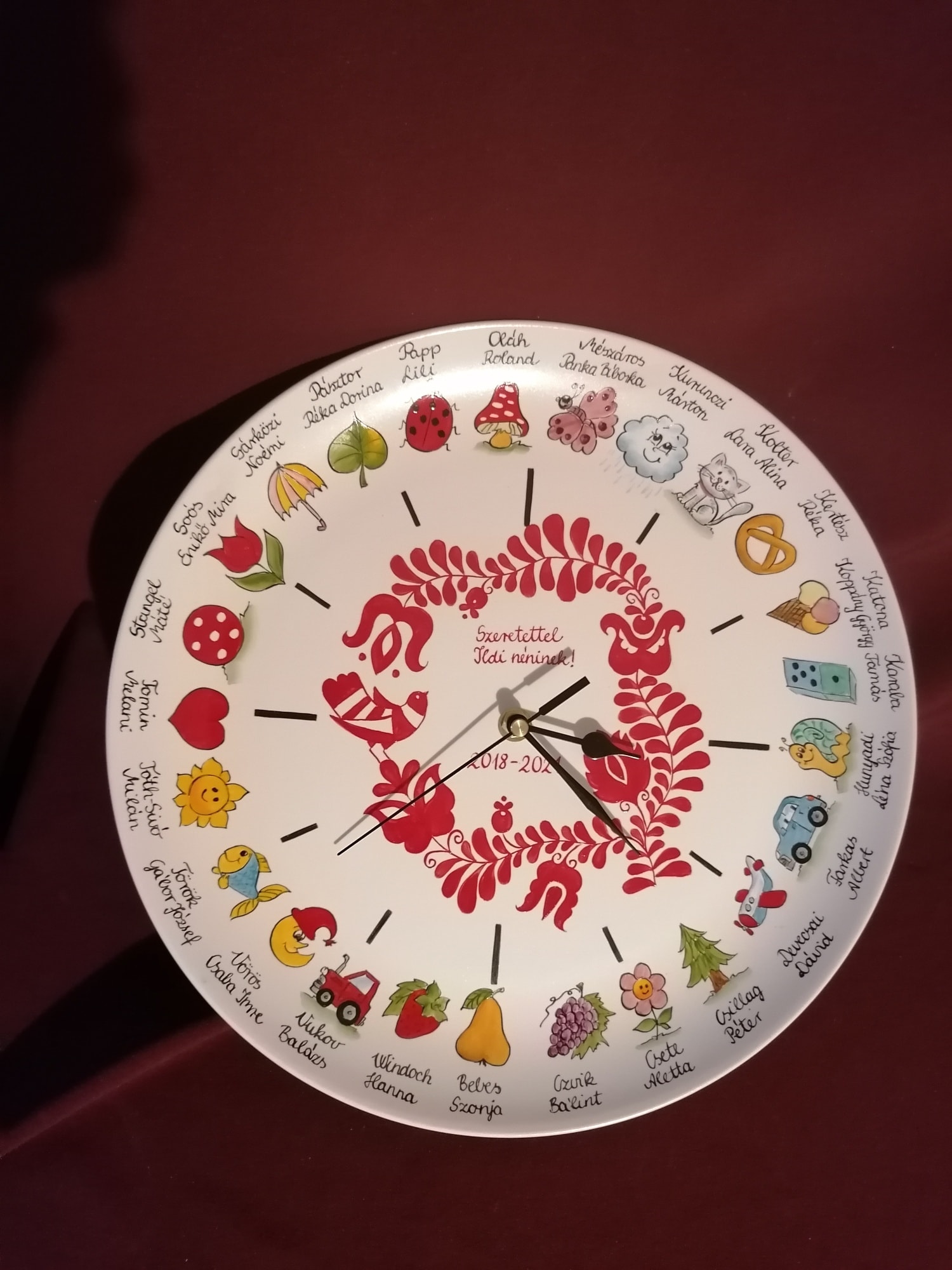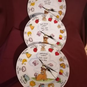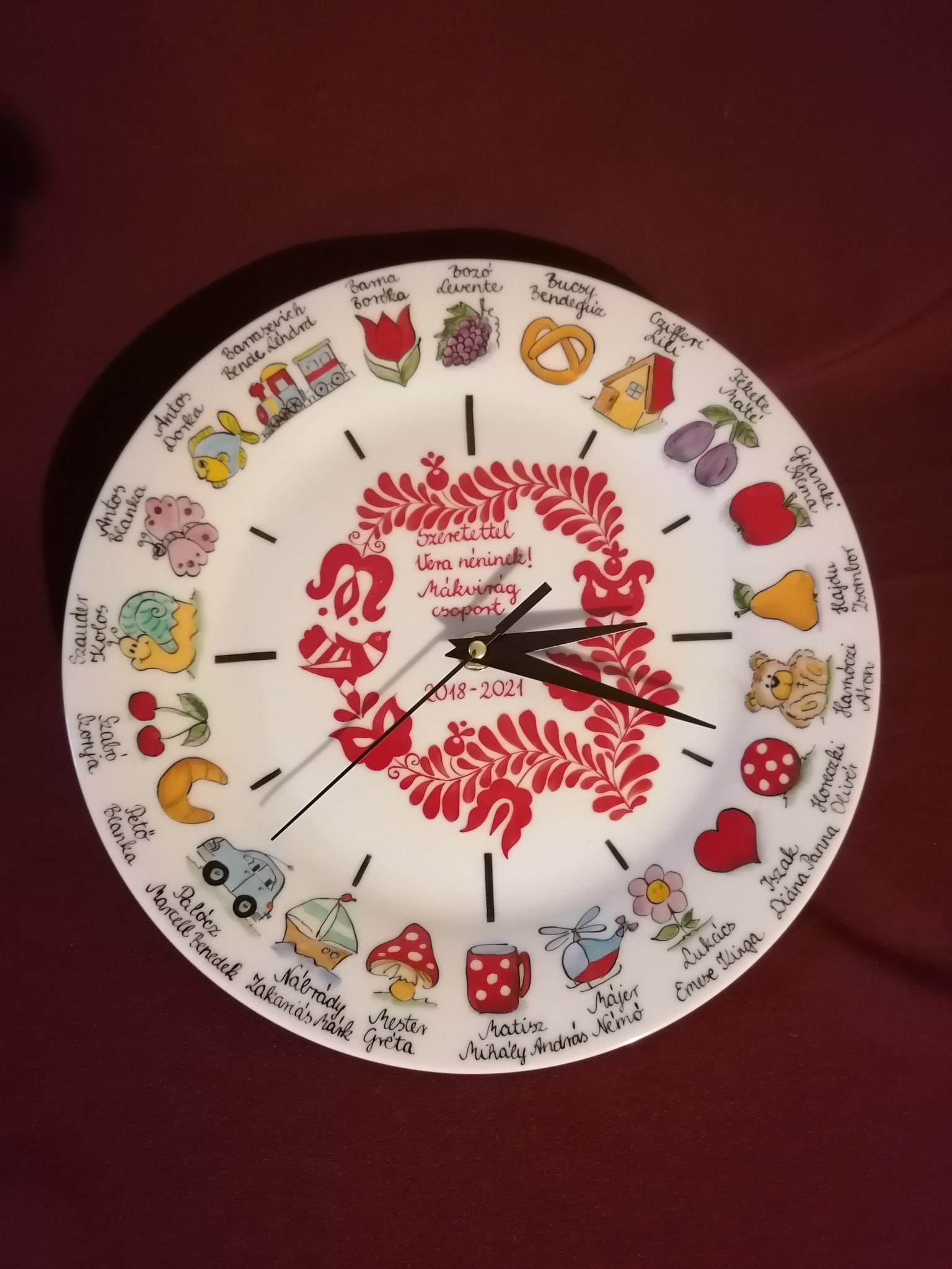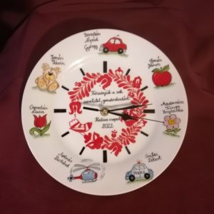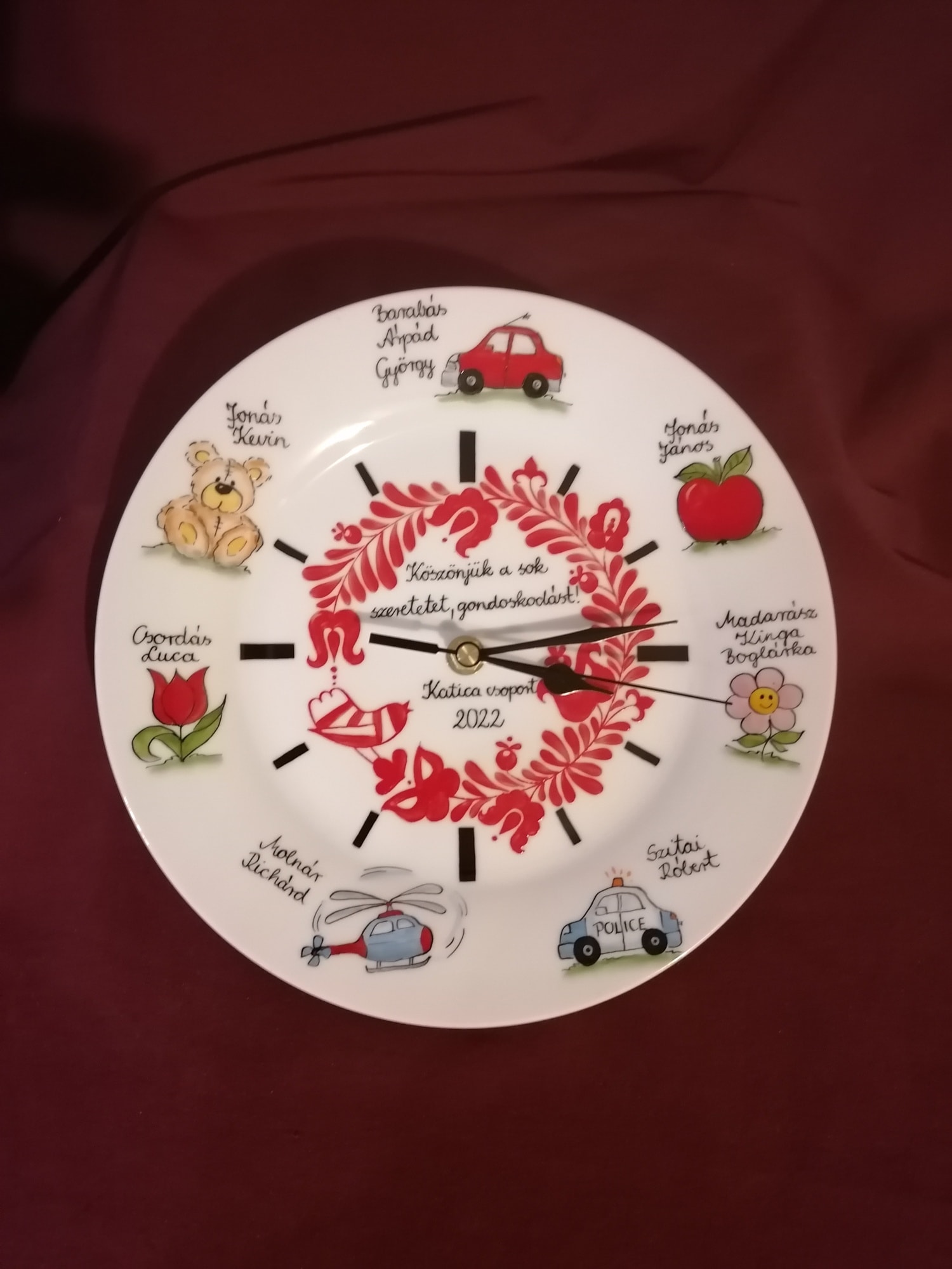 Ballagási ajándék porcelán óra egyedi mintával óvodai, bölcsődei ballagásra kézzel festve.