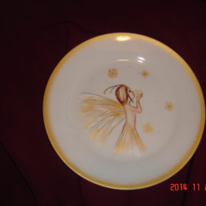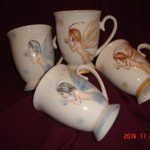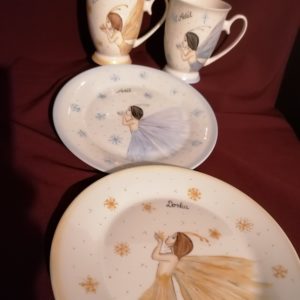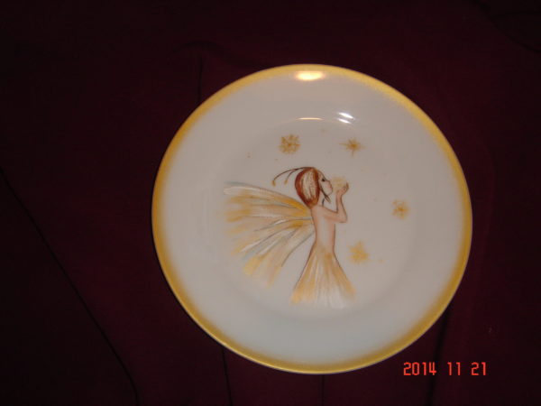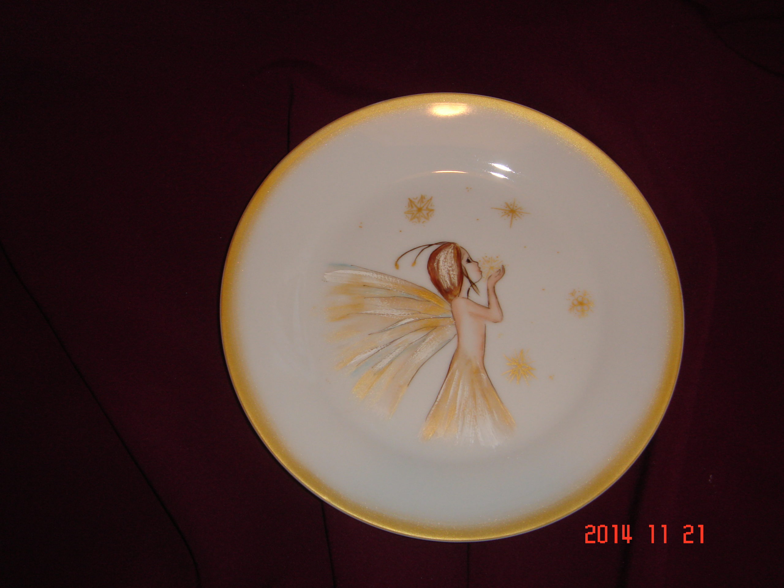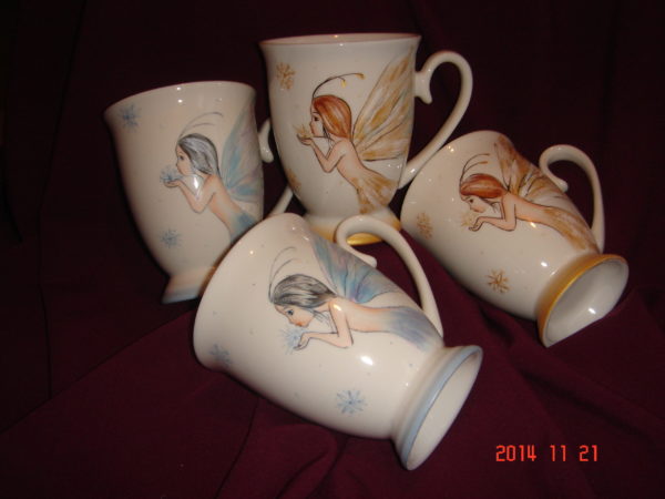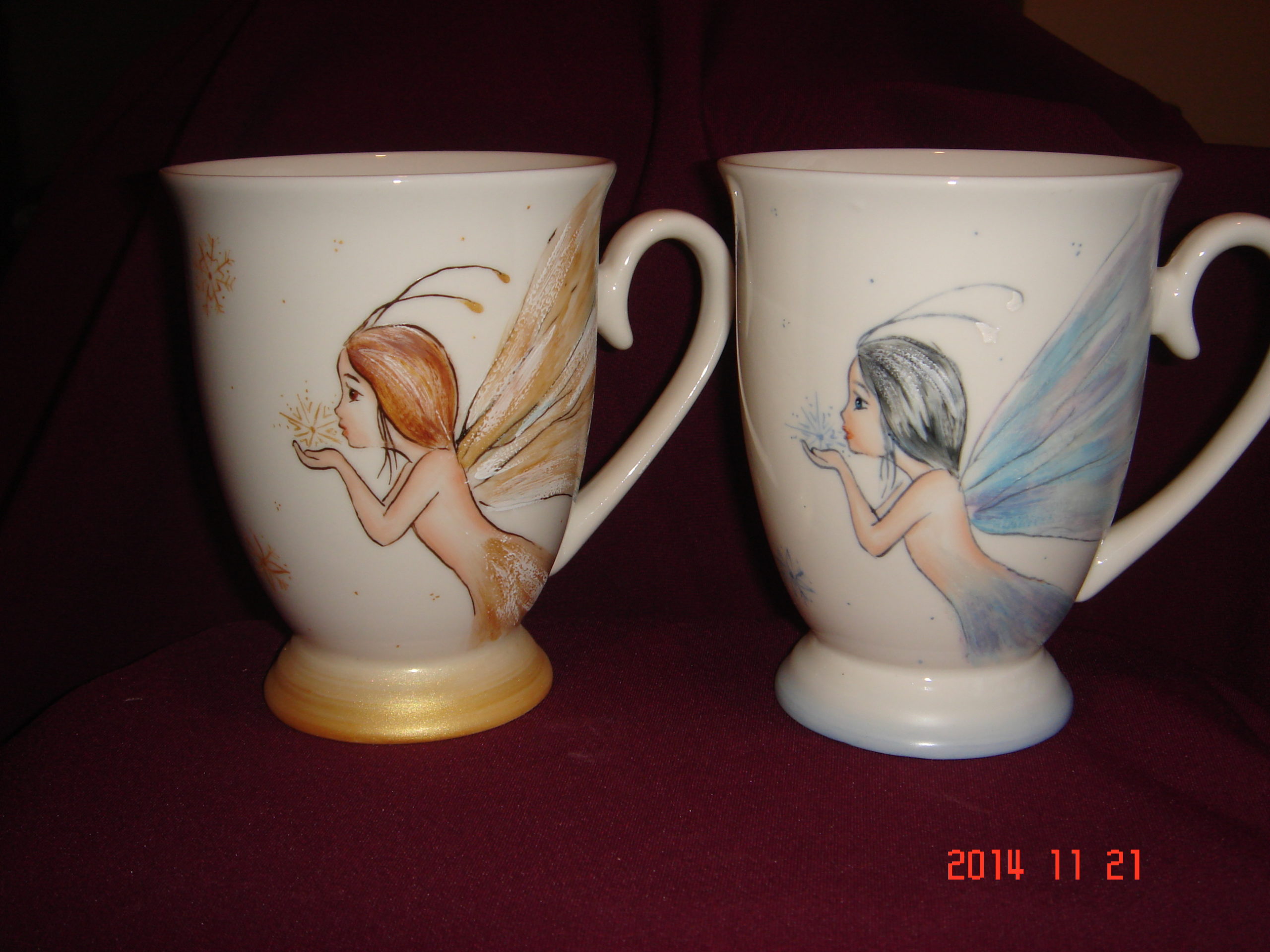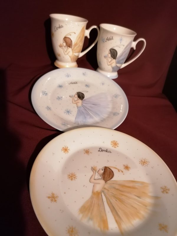 Kézzel festett karácsonyi porcelán, tündéres mintával.