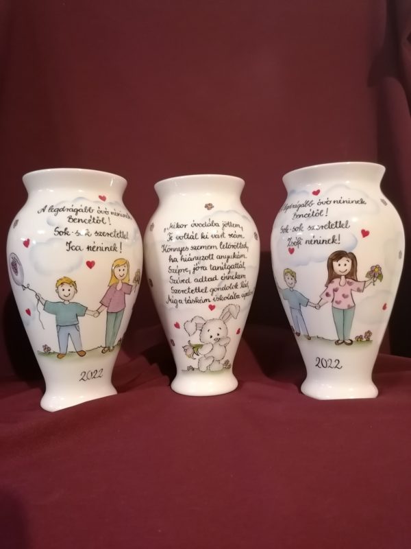 egyéni ajándékként adható, 20 cm-es kézzel festett porcelán ballagási váza.