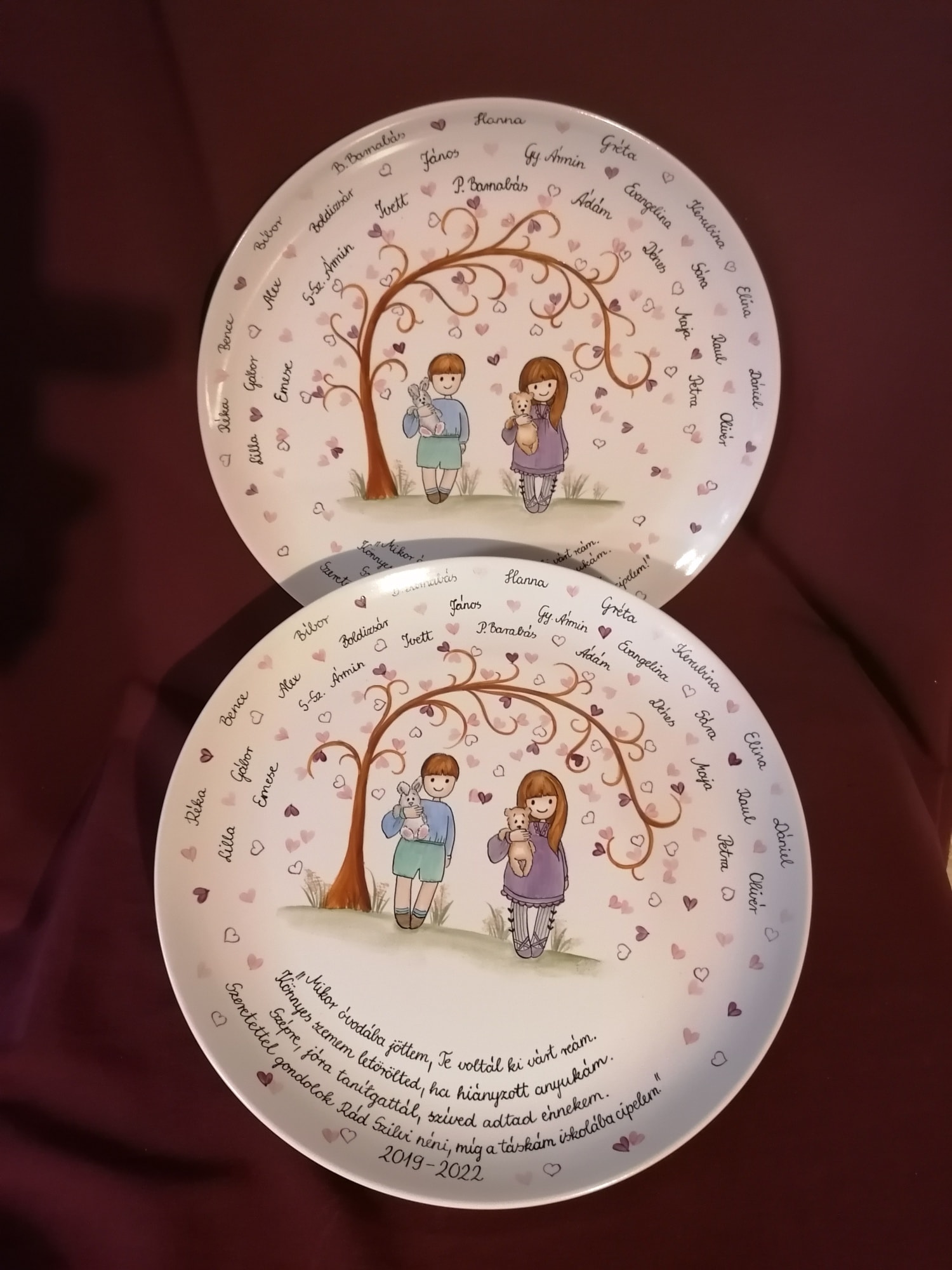 Kézzel festett ovis, iskolai ballagási tányér szívecskés, figurás mintával