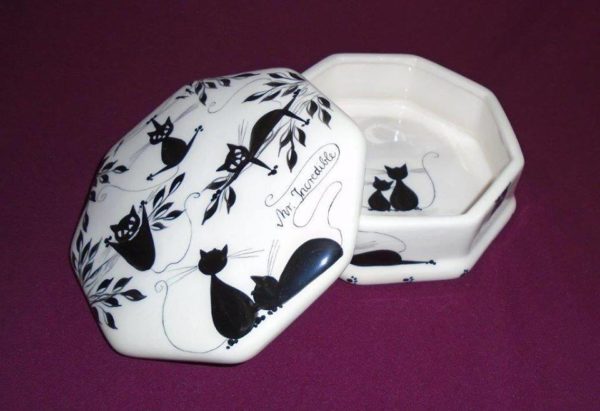 Kézzel festett cicás bonbonos kerámia doboz.