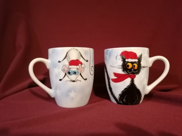 Macskás bögre, Kézzel festett karácsonyi cicás bögre egérrel, 2,5 dl-es