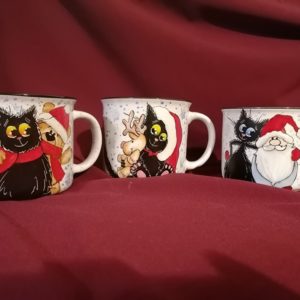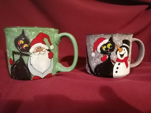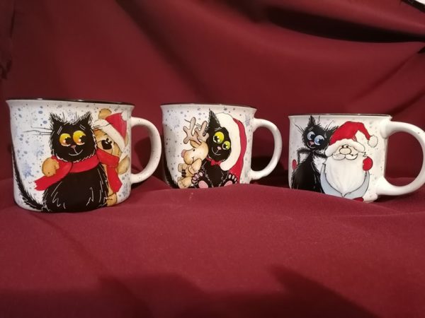 Kézzel festett cicás karácsonyi mintás zománc hatású kerámia bögre, 3-4,5 dl-es