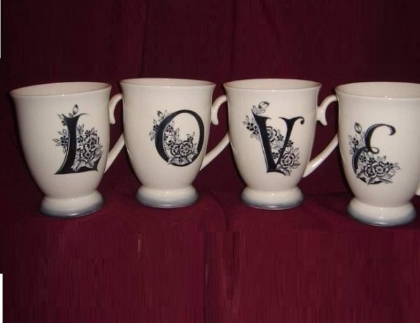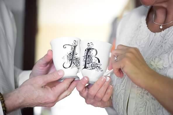 Nászajándék porcelán bögre szett, monogramos mintával.