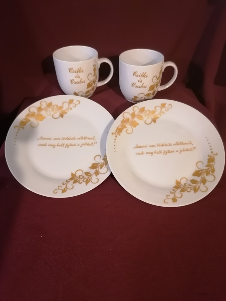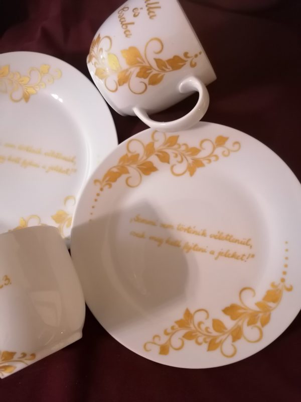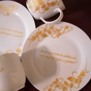 Nászajándék porcelán reggeliző szett, a meghívó mintája alapján kézzel festve.
