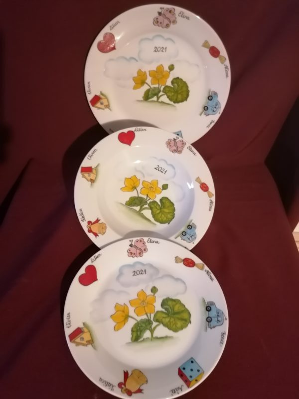 Kézzel festett óvodai ballagási tányér szett csoportjellel . A szett 20 cm-es, 24 cm-es lapostányért és egy 22 cm-es mélytányért tartalmaz.